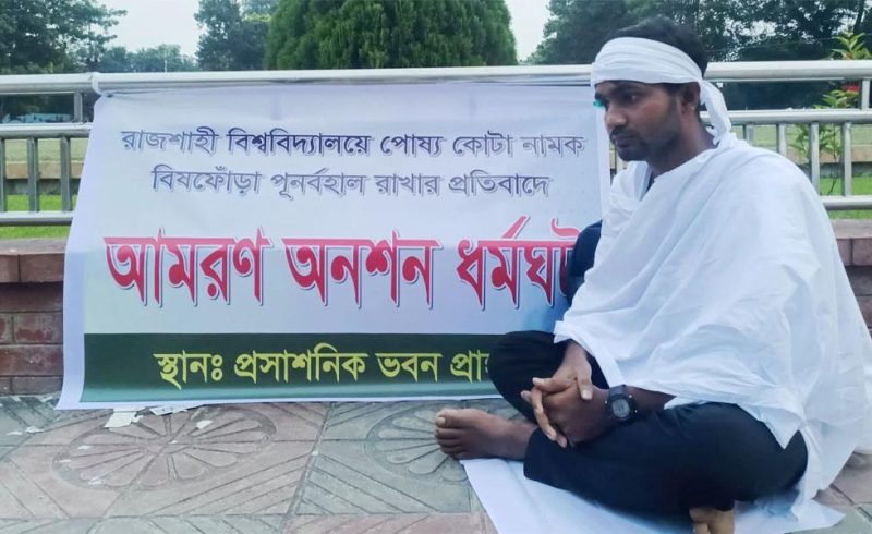 কাফনের কাপড় জড়িয়ে আমরণ অনশনে পোষ্য কোটা ফেরানোর প্রতিবাদে